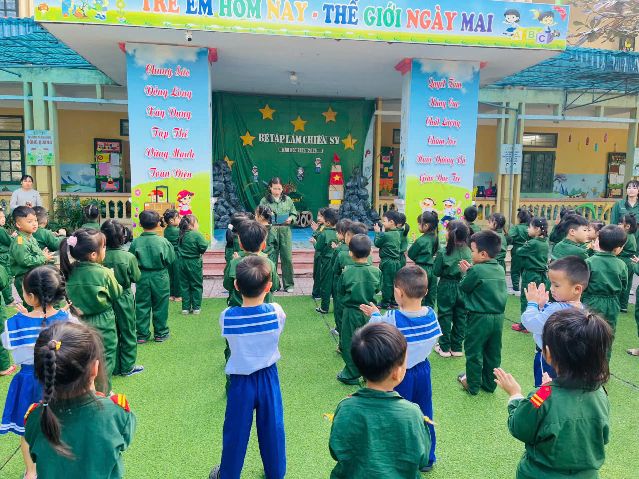 Hòa chung không khí phấn khởi Chào mừng 81 năm Ngày thành lập Quân đội Nhân dân Việt Nam (22/12/1944 – 22/12/2025), Thực hiến kế hoạch nhiệm vụ năm học 2025-2026 Trường Mầm non Hồng Quang đã tổ chức hoạt động trải nghiệm với chủ đề “BÉ TẬP LÀM CHIẾN SỸ” dành cho các bé trong toàn trường. Hoạt động trải nghiệm được tổ chức với nhiều nội dung phong phú, sinh động và phù hợp với lứa tuổi mầm non. Các bé được hóa thân thành những “chiến sĩ nhí” trong trang phục bộ đội, Hải quân, tham gia các hoạt động như: tập đội hình – đội ngũ, diễu hành, đồng diễn, vượt chướng ngại vật, vận chuyển lương thực, lăn, bò, trườn… Mỗi hoạt động không chỉ mang lại niềm vui mà còn giúp trẻ rèn luyện thể chất, tinh thần đoàn kết và ý thức kỷ luật. Thông qua hoạt động, các con được làm quen với hình ảnh Bộ đội Cụ Hồ – biểu tượng cao đẹp của lòng yêu nước, sự dũng cảm, kiên cường và tinh thần sẵn sàng bảo vệ Tổ quốc. Từ đó, giáo dục cho trẻ lòng biết ơn, niềm tự hào dân tộc và tình yêu quê hương đất nước ngay từ những năm tháng đầu đời. Hoạt động trải nghiệm “BÉ TẬP LÀM CHIẾN SỸ” không chỉ là sân chơi bổ ích mà còn là một giờ học thực tế sinh động, góp phần thực hiện hiệu quả mục tiêu giáo dục toàn diện cho trẻ mầm non. Các bé tham gia với tâm thế hào hứng, tự tin, để lại nhiều khoảnh khắc đáng yêu và những kỷ niệm đẹp dưới mái trường MẦM NON HỒNG QUANG thân yêu. Thông qua chương trình, Trường Mầm non Hồng Quang mong muốn tiếp tục lan tỏa những giá trị truyền thống tốt đẹp, đồng thời tạo điều kiện để trẻ được “học bằng trải nghiệm – lớn lên bằng yêu thương”, đúng với phương châm giáo dục lấy trẻ làm trung tâm. Sau đây là một số hình ảnh ghi nhận:
